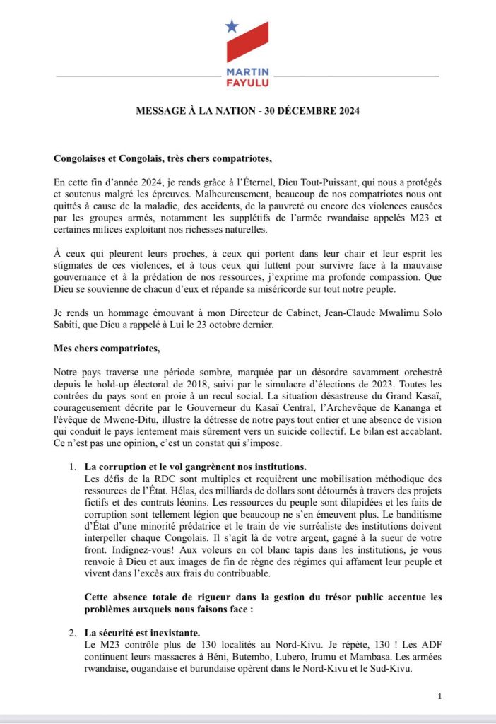 Dans son message à la nation ce 30 décembre à Kinshasa, l’opposant Martin Fayulu a dressé selon lui un tableau sombre de la gestion de Félix Tshisekedi six ans depuis sa prise de pouvoir.