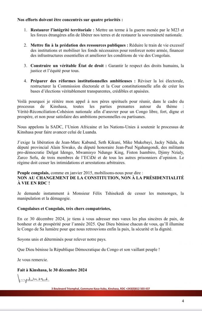 - Alors, je demande instamment à Monsieur Félix Tshisekedi de cesser les mensonges, la manipulation et la démagogie. Il doit tirer les conséquences de son bilan.» a-t-il fait savoir dans son message dont une copie est parvenue à investigateur.net