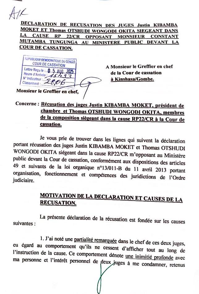 D’après Constant Mutamba ces récusations sont faites d’après les dispositions de l’article 49 de la loi organique n°13/011-B du 11 avril 2013 portant organisation, fonctionnements et compétences judiciaires, le Juge Justin KABAMBA MOKET président de la chambre est accusé, concomitamment avec Thomas OTSHUDI WONGONDI OKITA membre de la composition sous la cause RP 22/CR.