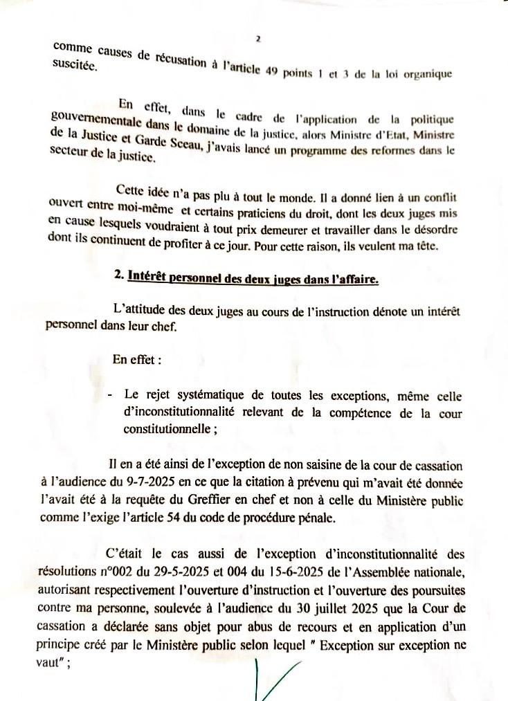 Dans sa lettre de récusation sans numéro adressée au greffier de la cour de cassation, l’ex ministre de la justice évoque plusieurs raisons l’ayant poussé à récuser les deux juges de la composition dans son affaire dont la mauvaise attitude de ces juges envers lui et ses avocats, le rejet systématique de toutes les exceptions soulevées même celles d’inconstitutionnalité évoqués par ses avocats, les menaces et intimidations envers sa personne ainsi qu’à ses avocats, la partialité remarquable de ces juges dans l’audiences du 23/07 et du 30/07/2025.