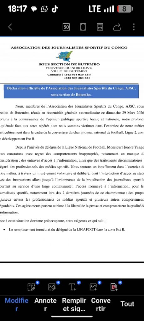 Les journalistes sportifs de Butembo ont décidé de durcir le ton. Réunis en assemblée générale extraordinaire ce dimanche 29 mars 2026, les membres de l’Association des Journalistes Sportifs du Congo AJSC sous section de Butembo ont annoncé un embargo immédiat sur la couverture du championnat national de football, Ligue 2, zone Est B qui se dispute au stade Van Nevel de Butembo au Nord-Kivu.